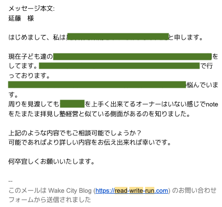 noteを読んで、本ブログの問合せフォームから連絡してくれる方もいます。自分のドメインで運営しているサイトは、安心感があるようです。